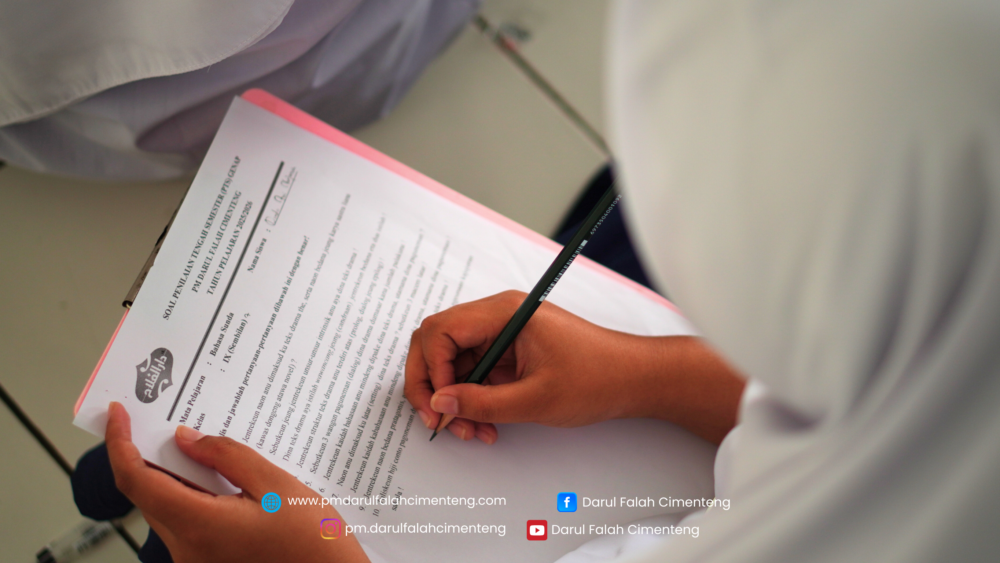 Kegiatan ini menjadi momen penting untuk mengevaluasi proses pembelajaran yang telah dilalui selama setengah semester. Lebih dari itu, PTS juga menjadi sarana untuk melatih kejujuran, ketelitian, kedisiplinan, dan kemandirian para santri dalam menghadapi setiap proses pembelajaran di Pondok Modern Darul Falah Cimenteng.